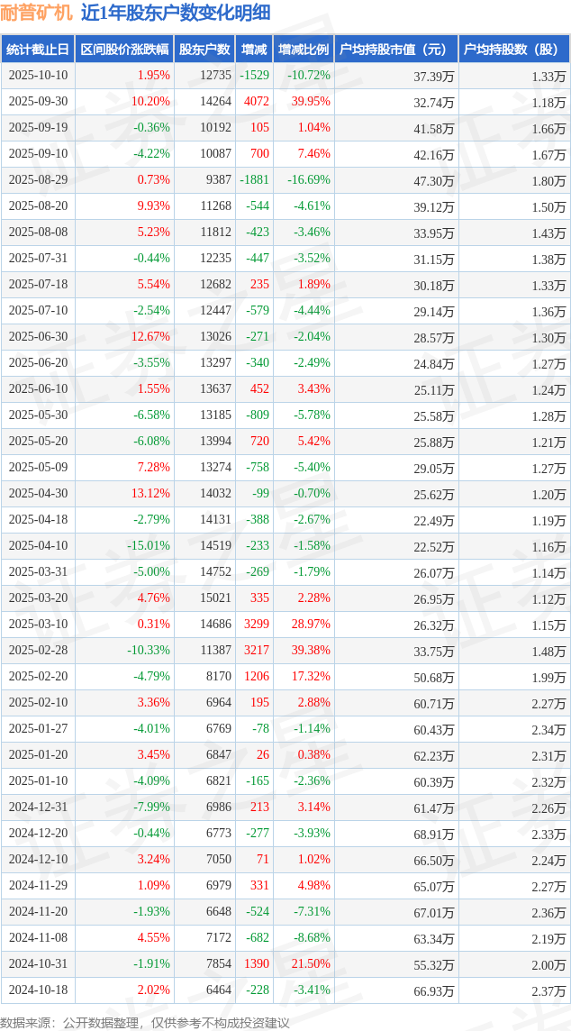 证券之星消息,近日耐普矿机披露,截至2025年10月10日公司股东户数为1.27万户,较9月30日减少1529.0户,减幅为10.72%。户均持股数量由上期的1.18万股增加至1.33万股,户均持股市值为37.39万元。
