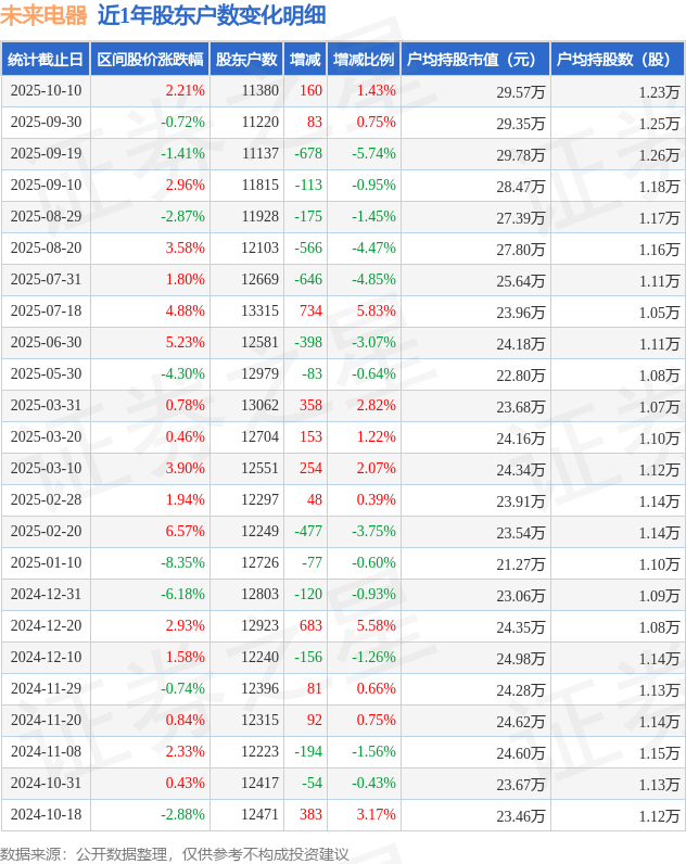 从股价来看,2025年9月30日至2025年10月10日,未来电器区间涨幅为2.21%,在此期间股东户数增加160.0户,增幅为1.43%。