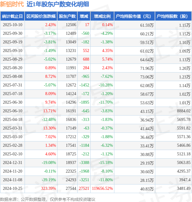 从股价来看,2025年9月30日至2025年10月10日,新铝时代区间涨幅为2.43%,在此期间股东户数增加17.0户,增幅为0.14%。