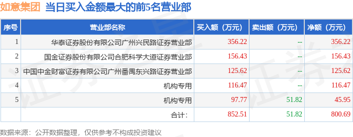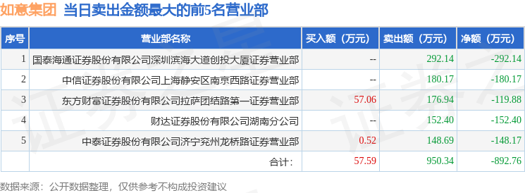 证券之星消息,沪深交易所2025年10月15日公布的交易公开信息显示,如意集团(002193)因日跌幅偏离值达到7%的前5只证券登上龙虎榜。此次是近5个交易日内第1次上榜。