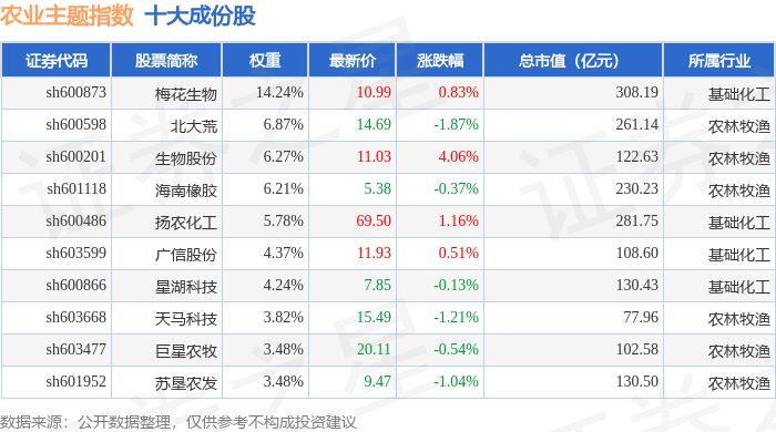 证券之星消息,10月15日,农业主题(000122)指数报收于1621.69点,涨0.33%,成交49.12亿元,换手率1.71%。当日该指数成份股中,上涨的有16家,宏辉果蔬以5.8%的涨幅领涨,下跌的有16家,万向德农以2.86%的跌幅领跌。