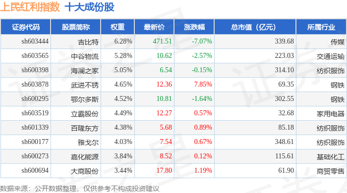 证券之星消息,10月15日,上民红利(000153)指数报收于3221.63点,涨0.48%,成交81.08亿元,换手率1.33%。当日该指数成份股中,上涨的有20家,水星家纺以9.41%的涨幅领涨,下跌的有9家,吉比特以7.07%的跌幅领跌。