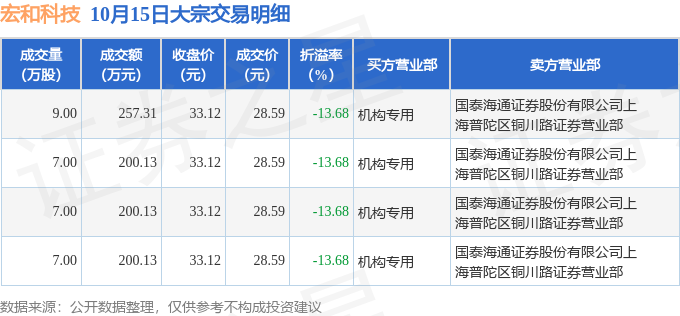 证券之星消息,10月15日宏和科技发生大宗交易,交易数据如下: