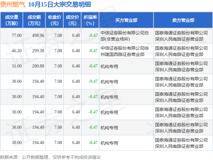 证券之星消息,10月15日贵州燃气发生大宗交易,交易数据如下:
