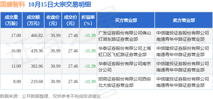 证券之星消息,10月15日国盛智科发生大宗交易,交易数据如下: