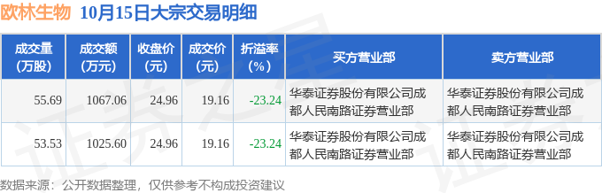 证券之星消息,10月15日欧林生物发生大宗交易,交易数据如下: