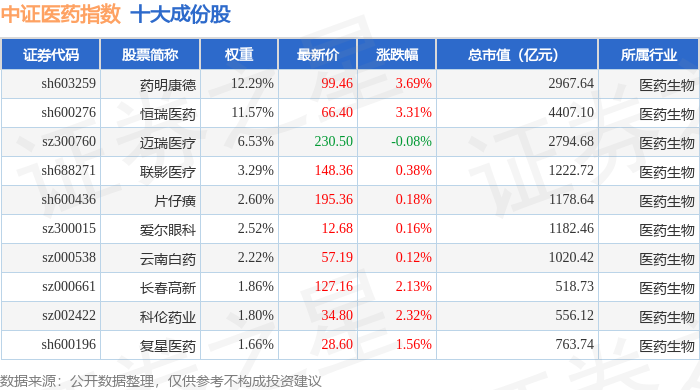 证券之星消息,10月15日,中证医药(000933)指数报收于8927.0点,涨1.72%,成交380.92亿元,换手率1.2%。当日该指数成份股中,上涨的有67家,华海药业以7.59%的涨幅领涨,下跌的有12家,华大智造以2.93%的跌幅领跌。