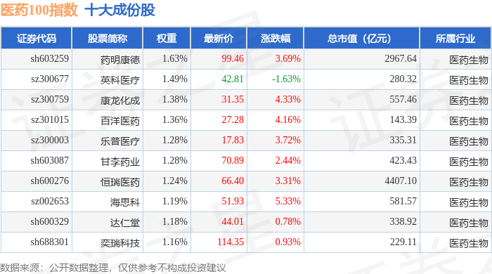 证券之星消息,10月15日,医药100(000978)指数报收于11350.86点,涨1.49%,成交419.77亿元,换手率1.2%。当日该指数成份股中,上涨的有84家,华海药业以7.59%的涨幅领涨,下跌的有15家,华大智造以2.93%的跌幅领跌。
