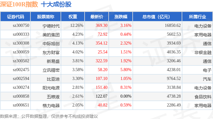 证券之星消息,10月15日,深证100R(399004)指数报收于8145.88点,涨1.86%,成交2430.76亿元,换手率1.53%。当日该指数成份股中,上涨的有76家,三花智控以10.01%的涨幅领涨,下跌的有22家,赣锋锂业以3.42%的跌幅领跌。