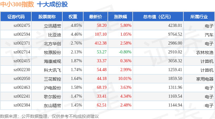 中小300(399008)指数十大成份股详情如下: