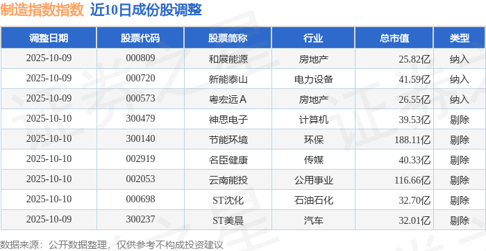 近10日内制造指数(399233)成份股做了调整,新纳入了3只股票,剔除了6只股票。