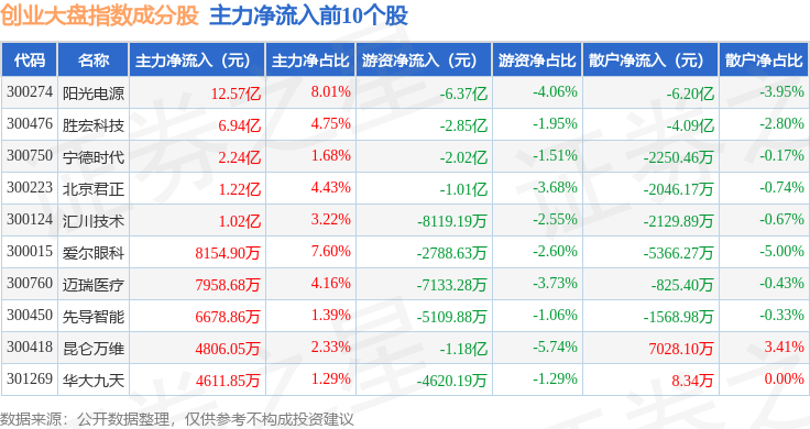 资金流向方面,创业大盘(399293)指数成份股当日主力资金净流入合计11.83亿元,游资资金净流出合计14.49亿元,散户资金净流入合计2.66亿元。成份股资金流向详情见下表:
