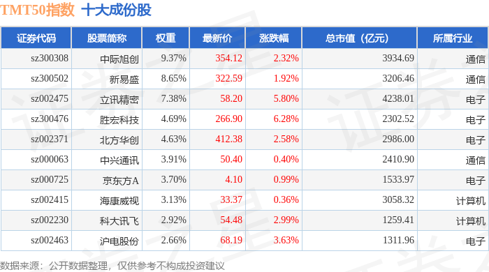 TMT50(399610)指数十大成份股详情如下: