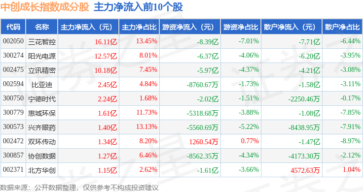 资金流向方面,中创成长(399626)指数成份股当日主力资金净流入合计1.9亿元,游资资金净流出合计29.7亿元,散户资金净流入合计27.8亿元。成份股资金流向详情见下表: