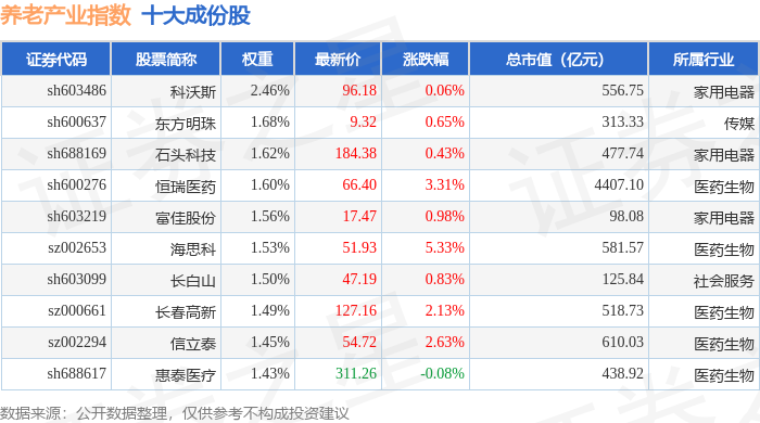 养老产业(399812)指数十大成份股详情如下: