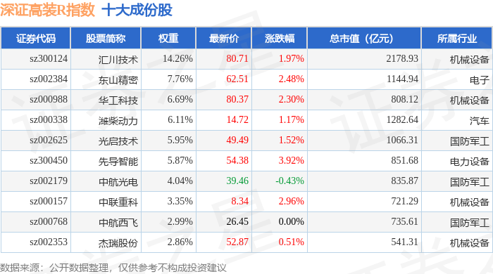 证券之星消息,10月15日,深证高装R(470037)指数报收于3259.82点,涨1.78%,成交460.34亿元,换手率2.81%。当日该指数成份股中,上涨的有42家,麦格米特以7.09%的涨幅领涨,下跌的有7家,奥普光电以10.01%的跌幅领跌。