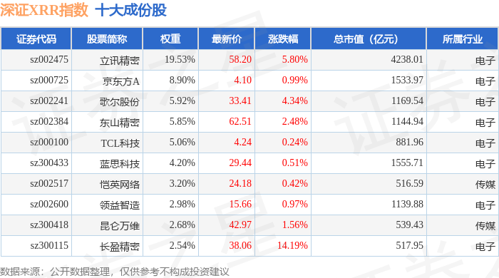 证券之星消息,10月15日,深证XRR(470046)指数报收于2422.8点,涨2.49%,成交641.93亿元,换手率2.59%。当日该指数成份股中,上涨的有45家,长盈精密以14.19%的涨幅领涨,下跌的有4家,福晶科技以3.72%的跌幅领跌。