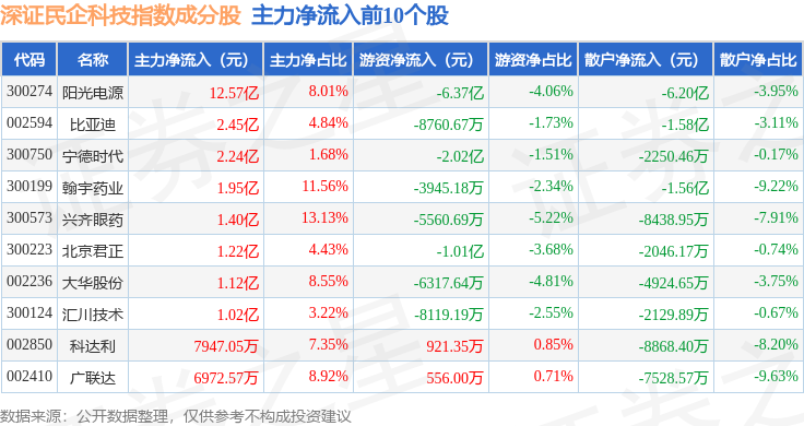 资金流向方面,深证民企科技(970059)指数成份股当日主力资金净流入合计14.48亿元,游资资金净流出合计11.62亿元,散户资金净流出合计2.86亿元。成份股资金流向详情见下表: