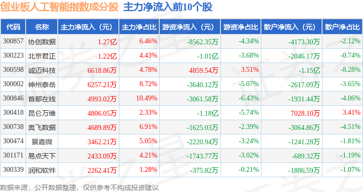 资金流向方面,创业板人工智能(970070)指数成份股当日主力资金净流出合计7.66亿元,游资资金净流出合计1.41亿元,散户资金净流入合计9.07亿元。成份股资金流向详情见下表:
