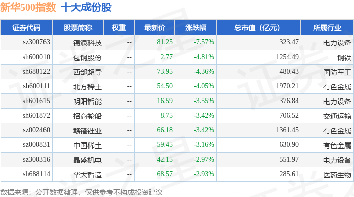 证券之星消息,10月15日,新华500(989001)指数报收于5089.83点,涨1.46%,成交8199.68亿元,换手率1.02%。当日该指数成份股中,上涨的有371家,三花智控以10.01%的涨幅领涨,下跌的有109家,锦浪科技以7.57%的跌幅领跌。