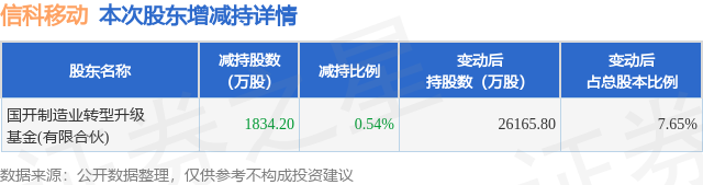 证券之星消息,10月15日信科移动发布公告《信科移动:关于持股5%以上股东及其一致行动人权益变动触及1%刻度的提示性公告》,其股东国开制造业转型升级基金(有限合伙)于2025年9月26日至2025年10月15日间合计减持1834.2万股,占公司目前总股本的0.5365%,变动期间该股股价上涨4.57%,截止10月15日收盘报6.87元。