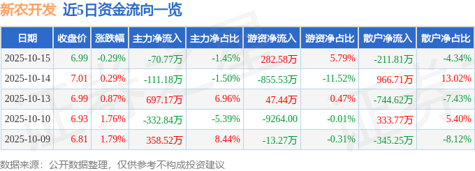 证券之星消息,截至2025年10月15日收盘,新农开发(600359)报收于6.99元,下跌0.29%,换手率1.84%,成交量7.01万手,成交额4883.77万元。