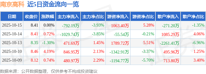 证券之星消息,截至2025年10月15日收盘,南京高科(600064)报收于8.41元,上涨0.0%,换手率1.38%,成交量23.88万手,成交额2.02亿元。