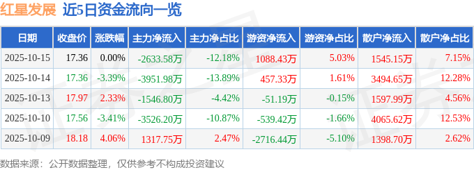 证券之星消息,截至2025年10月15日收盘,红星发展(600367)报收于17.36元,上涨0.0%,换手率3.86%,成交量12.43万手,成交额2.16亿元。