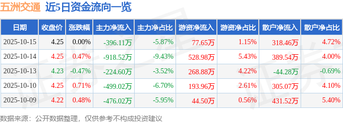 证券之星消息,截至2025年10月15日收盘,五洲交通(600368)报收于4.25元,上涨0.0%,换手率0.99%,成交量15.88万手,成交额6748.39万元。