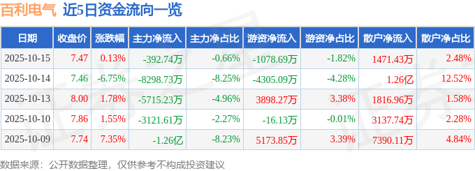 证券之星消息,截至2025年10月15日收盘,百利电气(600468)报收于7.47元,上涨0.13%,换手率7.36%,成交量80.01万手,成交额5.92亿元。