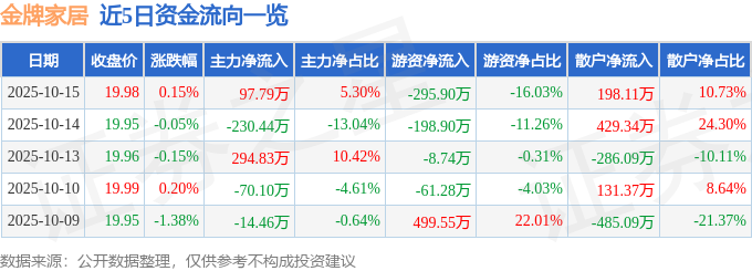 证券之星消息,截至2025年10月15日收盘,金牌家居(603180)报收于19.98元,上涨0.15%,换手率0.6%,成交量9234.0手,成交额1846.17万元。