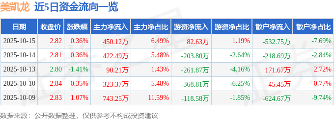 10月15日的资金流向数据方面,主力资金净流入450.12万元,占总成交额6.49%,游资资金净流入82.63万元,占总成交额1.19%,散户资金净流出532.75万元,占总成交额7.69%。
