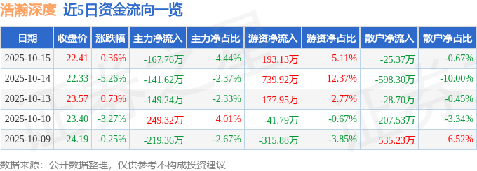证券之星消息,截至2025年10月15日收盘,浩瀚深度(688292)报收于22.41元,上涨0.36%,换手率1.67%,成交量1.68万手,成交额3777.27万元。