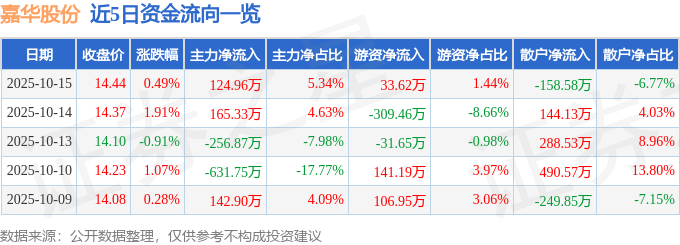 证券之星消息,截至2025年10月15日收盘,嘉华股份(603182)报收于14.44元,上涨0.49%,换手率0.99%,成交量1.63万手,成交额2341.42万元。