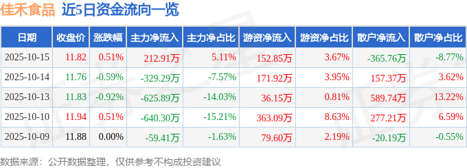 证券之星消息,截至2025年10月15日收盘,佳禾食品(605300)报收于11.82元,上涨0.51%,换手率0.78%,成交量3.54万手,成交额4169.83万元。