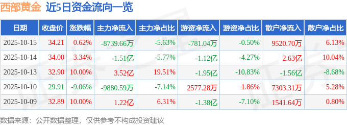 证券之星消息,截至2025年10月15日收盘,西部黄金(601069)报收于34.21元,上涨0.62%,换手率5.21%,成交量46.21万手,成交额15.52亿元。