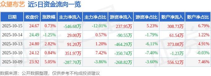 10月15日的资金流向数据方面,主力资金净流出546.68万元,占总成交额12.01%,游资资金净流入237.95万元,占总成交额5.23%,散户资金净流入308.73万元,占总成交额6.79%。