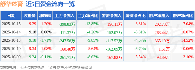证券之星消息,截至2025年10月15日收盘,舒华体育(605299)报收于9.29元,上涨1.2%,换手率0.76%,成交量3.11万手,成交额2878.81万元。