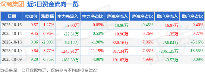 证券之星消息,截至2025年10月15日收盘,汉商集团(600774)报收于9.57元,上涨1.27%,换手率1.49%,成交量4.39万手,成交额4198.69万元。