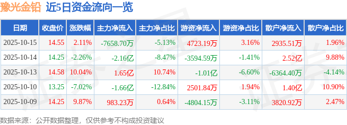 证券之星消息,截至2025年10月15日收盘,豫光金铅(600531)报收于14.55元,上涨2.11%,换手率9.45%,成交量102.98万手,成交额14.94亿元。