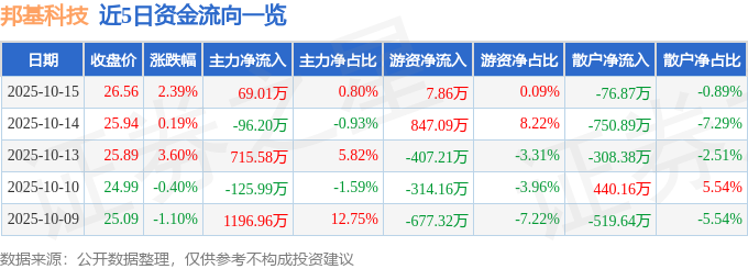 证券之星消息,截至2025年10月15日收盘,邦基科技(603151)报收于26.56元,上涨2.39%,换手率3.87%,成交量3.24万手,成交额8635.14万元。