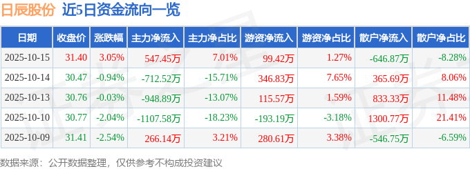 证券之星消息,截至2025年10月15日收盘,日辰股份(603755)报收于31.4元,上涨3.05%,换手率2.54%,成交量2.5万手,成交额7810.75万元。