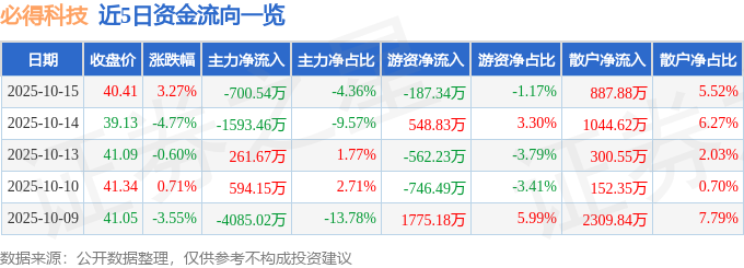 证券之星消息,截至2025年10月15日收盘,必得科技(605298)报收于40.41元,上涨3.27%,换手率2.17%,成交量4.0万手,成交额1.61亿元。