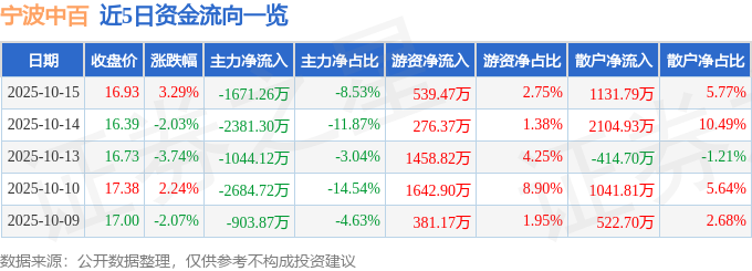 证券之星消息,截至2025年10月15日收盘,宁波中百(600857)报收于16.93元,上涨3.29%,换手率5.18%,成交量11.63万手,成交额1.96亿元。
