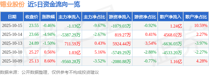 证券之星消息,截至2025年10月15日收盘,锡业股份(000960)报收于23.55元,下跌0.46%,换手率3.05%,成交量50.19万手,成交额11.72亿元。