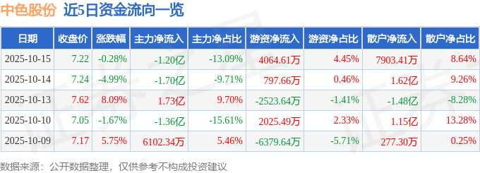 证券之星消息,截至2025年10月15日收盘,中色股份(000758)报收于7.22元,下跌0.28%,换手率6.37%,成交量125.94万手,成交额9.14亿元。