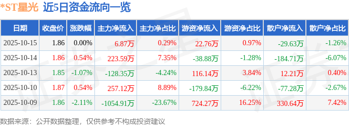 证券之星消息,截至2025年10月15日收盘,*ST星光(002076)报收于1.86元,上涨0.0%,换手率1.22%,成交量12.67万手,成交额2350.48万元。