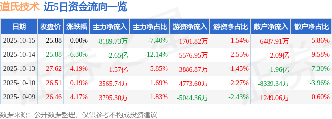 证券之星消息,截至2025年10月15日收盘,道氏技术(300409)报收于25.88元,上涨0.0%,换手率6.31%,成交量43.35万手,成交额11.06亿元。