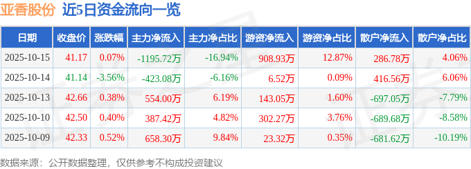 10月15日的资金流向数据方面,主力资金净流出1195.72万元,占总成交额16.94%,游资资金净流入908.93万元,占总成交额12.87%,散户资金净流入286.78万元,占总成交额4.06%。