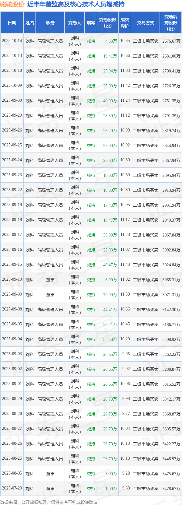 骆驼股份近半年内的董监高及核心技术人员增减持详情如下: